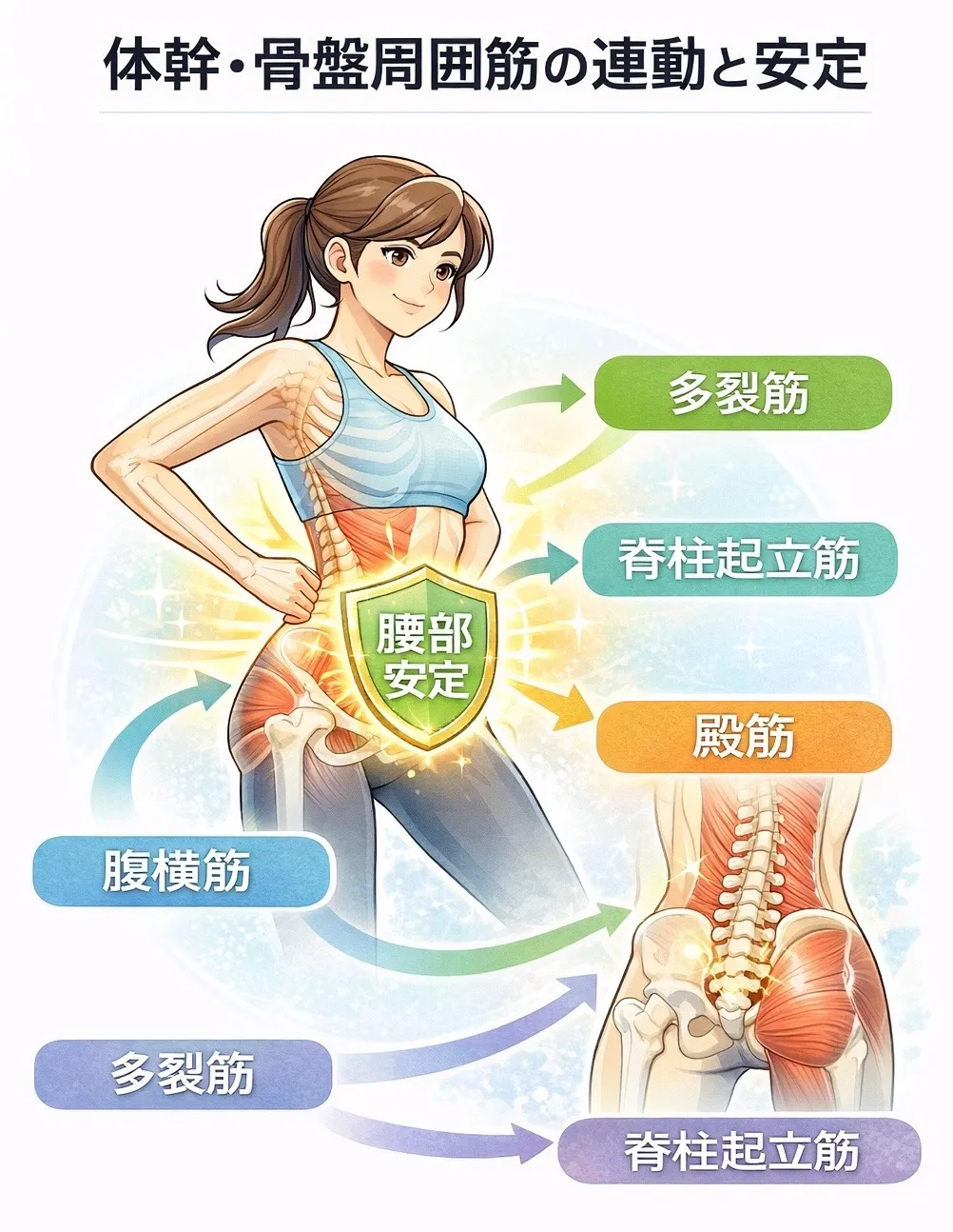 骨盤・脊柱周囲の動きを安定させ、腰部への“局所負担”を減らすことにつながります。