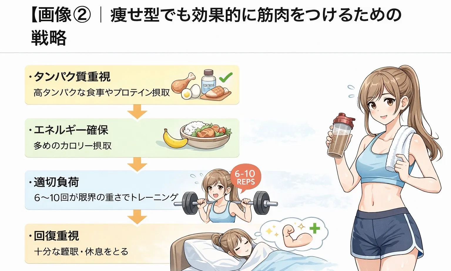 痩せ型は確かに「つきにくい傾向」はありますが、正しい刺激・栄養・休養の組み合わせで着実に筋肉は増えます。