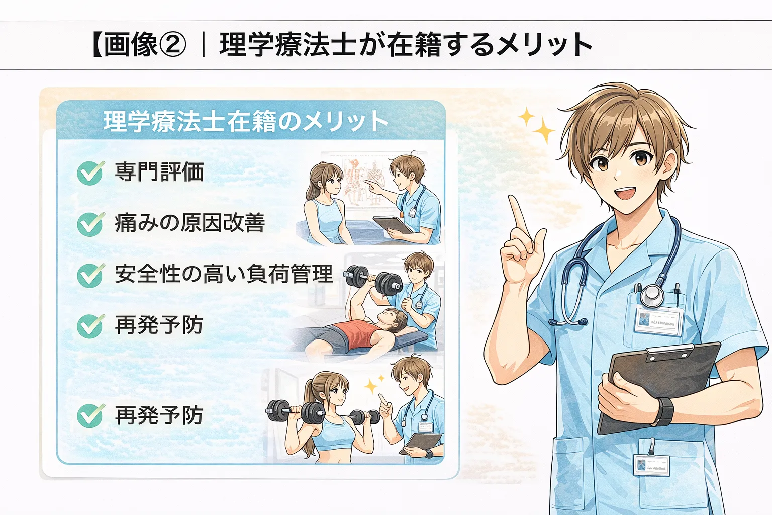 理学療法士が在籍することの付加価値は大きく分けて次の3点です: