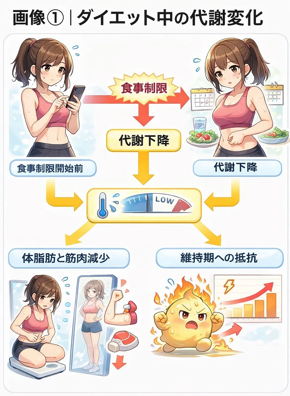 ダイエットによって体脂肪が減ると、身体は「栄養不足だ」と誤解し、基礎代謝を下げようとする適応反応(adaptive thermogenesis)が起こります。
