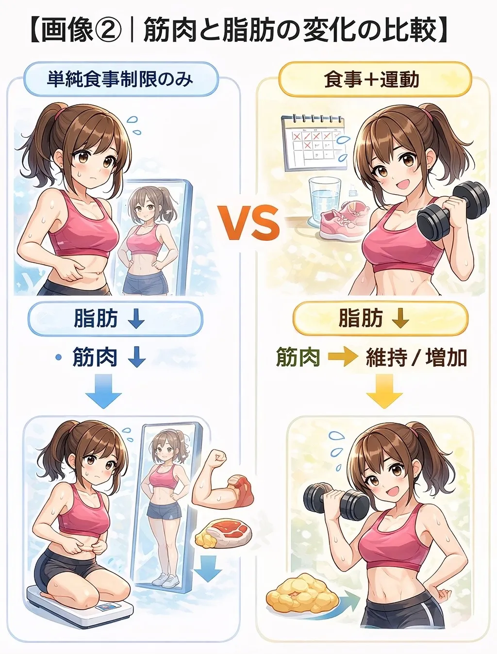 極端なカロリー制限は筋肉を減らしやすく、代謝低下を招きます。バランスの取れたカロリー設定が必須です。