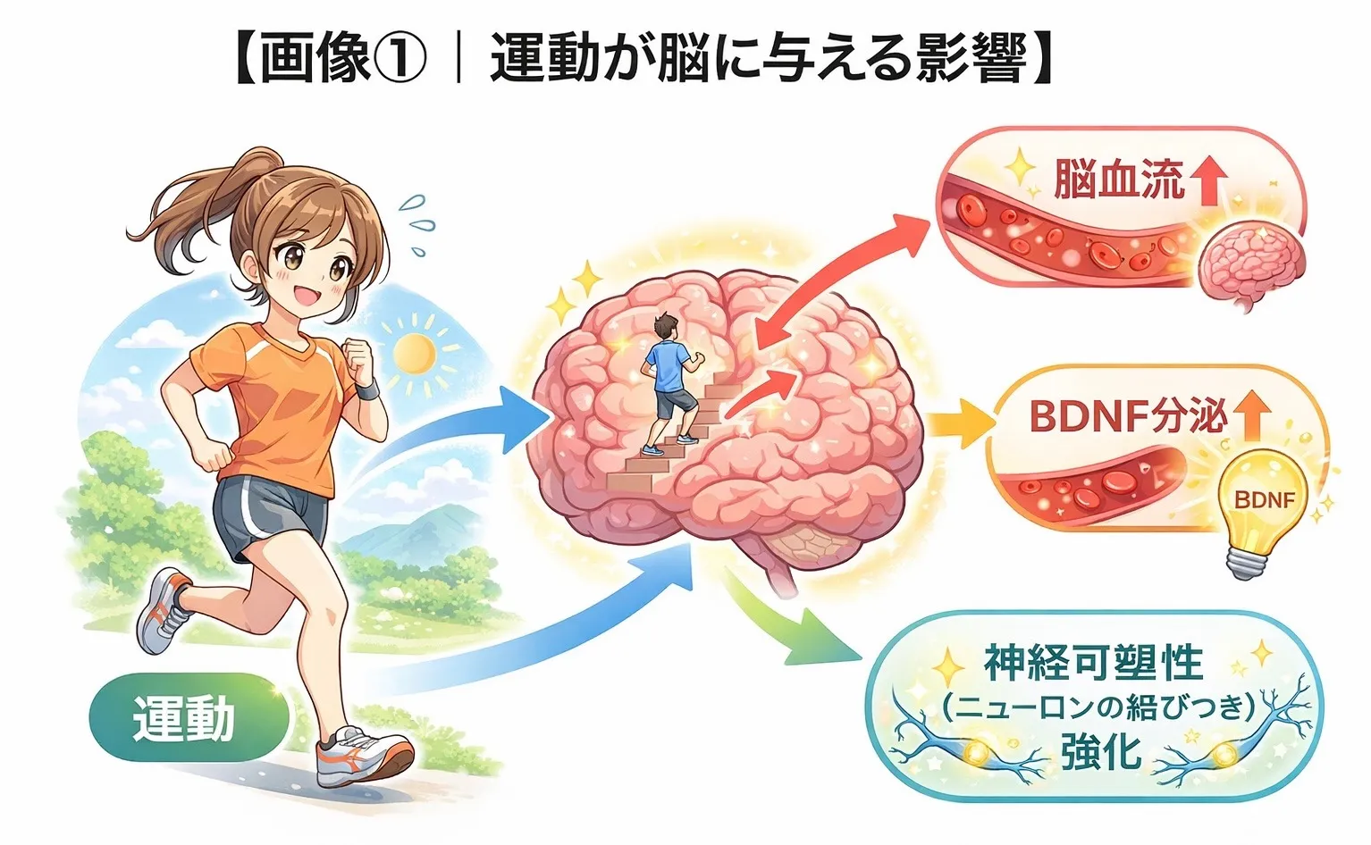 運動をすると全身の血流が増えるだけでなく、脳への血流も増加します。