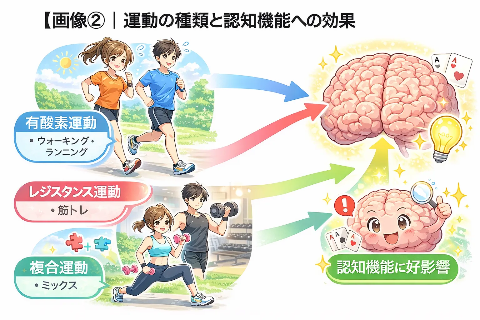 ✔ 有酸素・筋トレ・複合運動はいずれも認知機能に良い影響を与える。