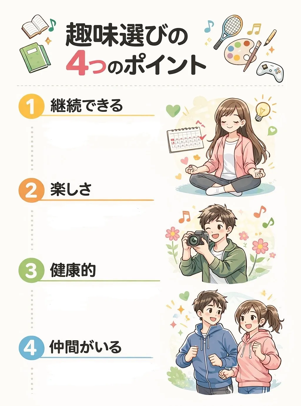 社会人が趣味を選ぶときのポイントは次の通りです: