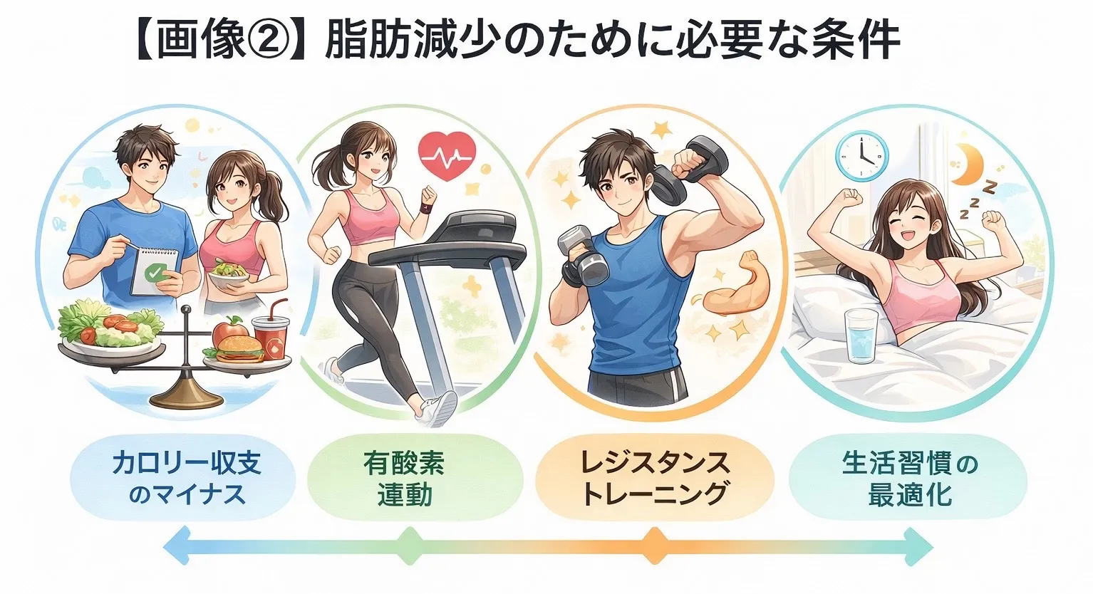 体脂肪を減らすには、以下のような生理学的・運動学的条件が重要とされています: