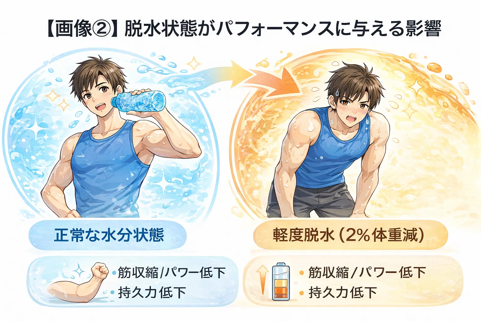 脱水(体内水分が不足した状態)は、運動パフォーマンスや筋肉機能に悪影響を及ぼします。