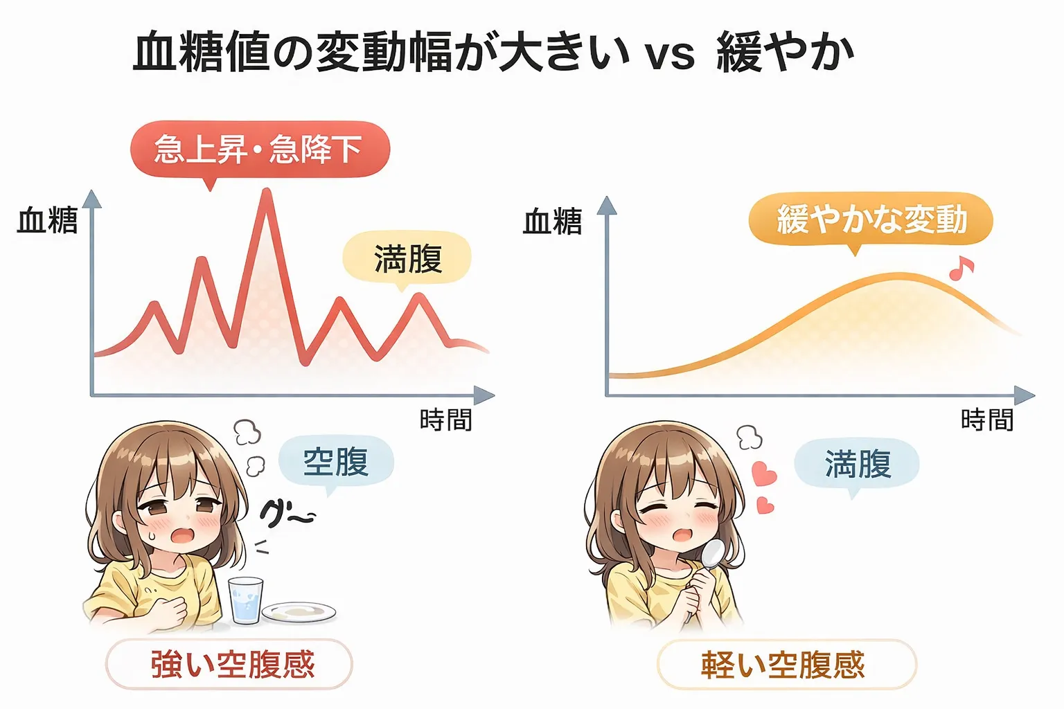 しかし、血糖値の変動が大きいと、下がるタイミングで強い空腹感が起こりやすいという特徴があります。