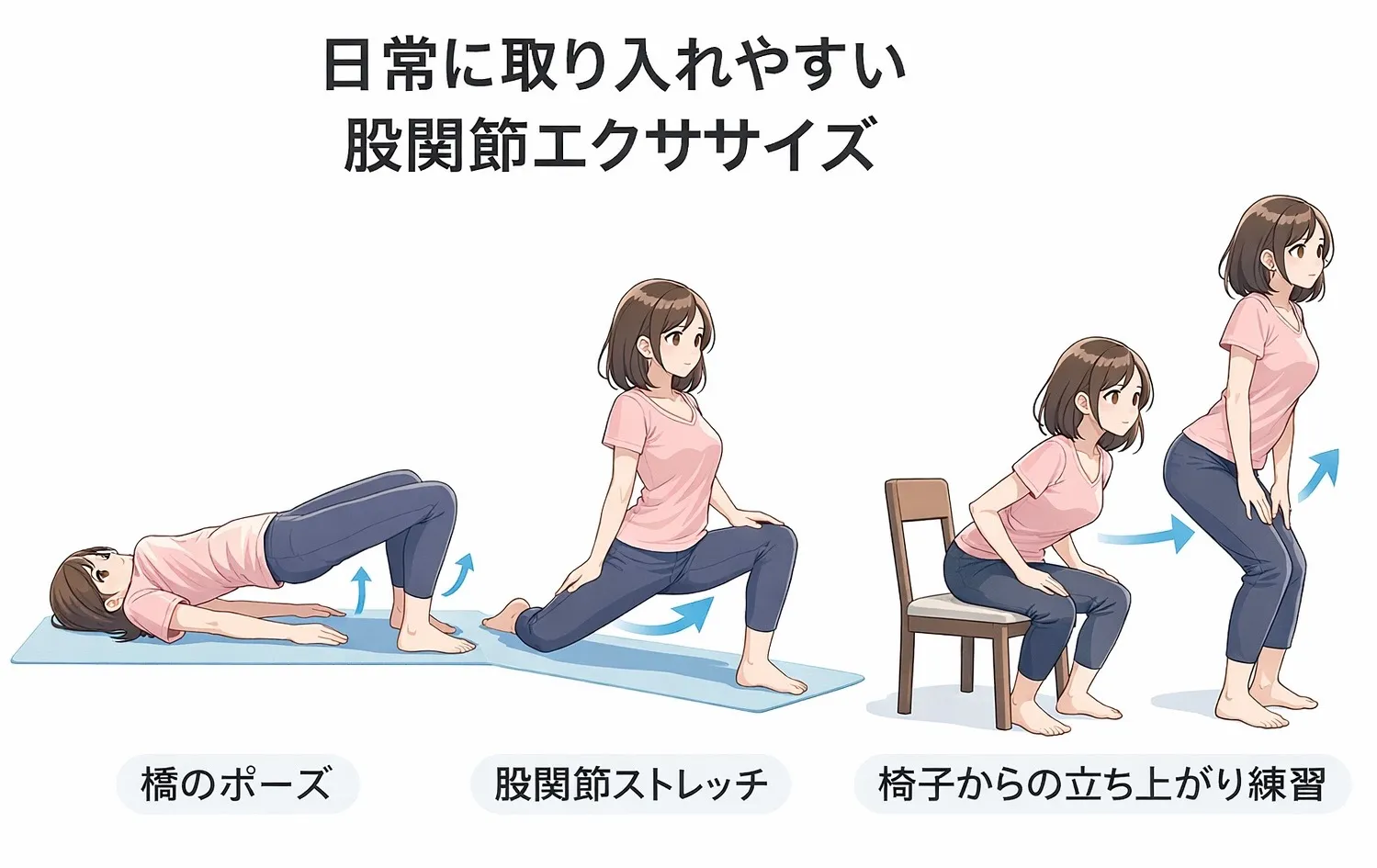 屈曲・伸展・外転・内旋といった股関節の自然な可動性を維持・改善することが重要です。