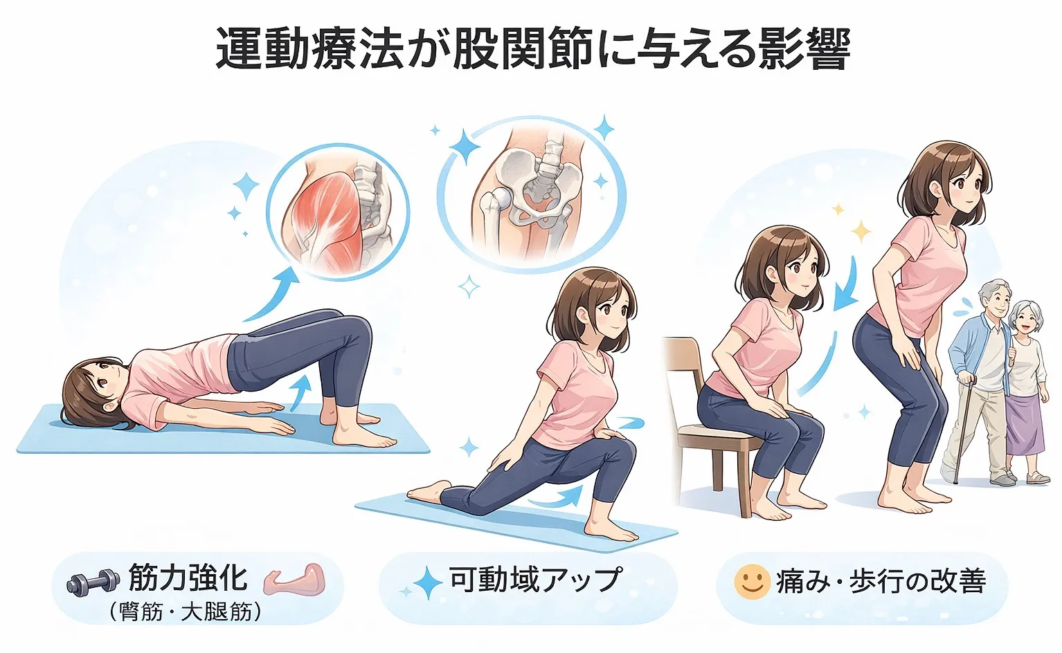 股関節周囲の筋肉(大殿筋・中殿筋・大腿四頭筋・ハムストリングス)の強化は、関節の安定性・支持性を高め、痛みを軽減します。