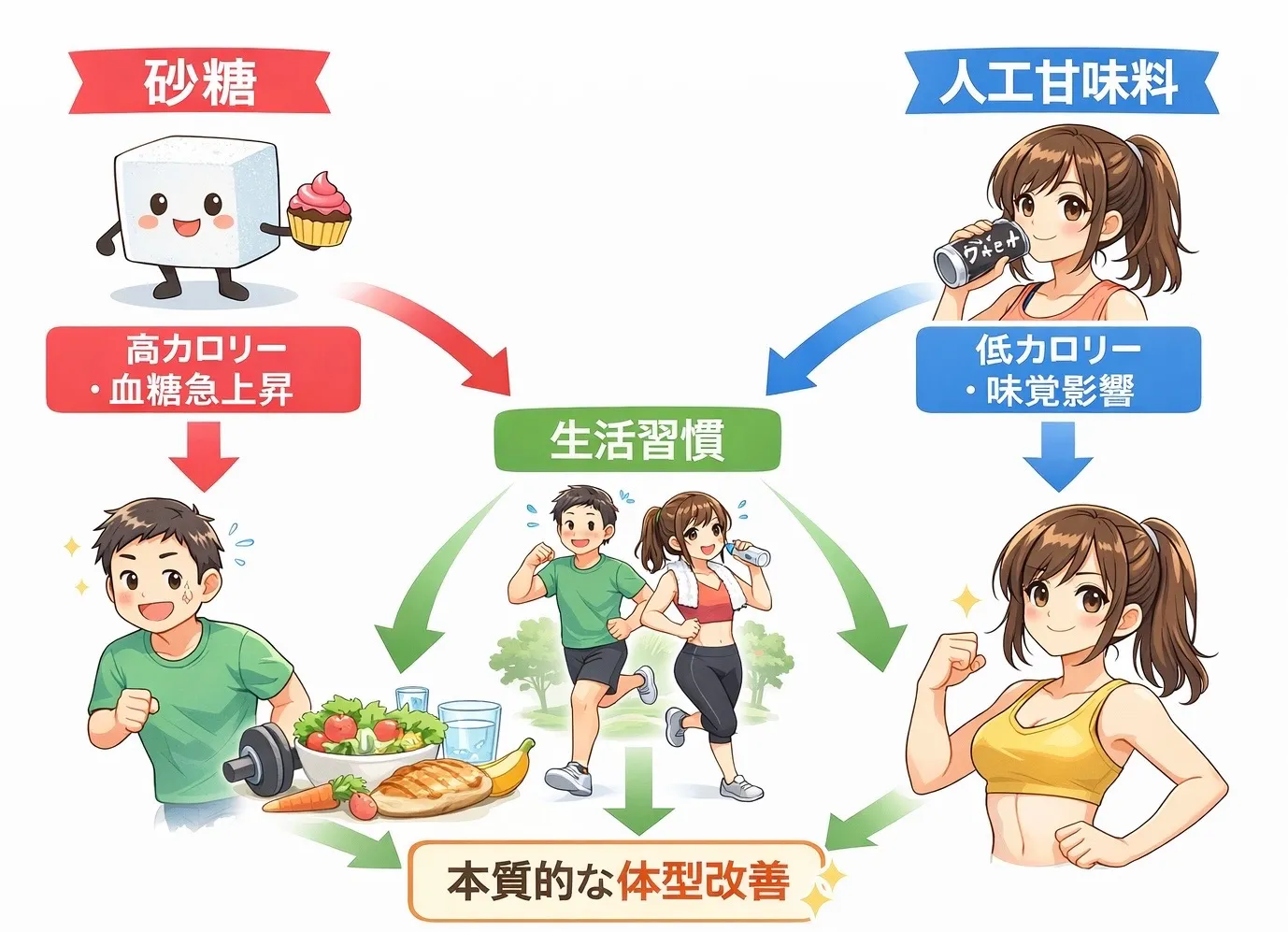 ✔ 人工甘味料は糖質制限の補助にはなるが、全体の食生活・運動(筋トレ)改善が鍵である。