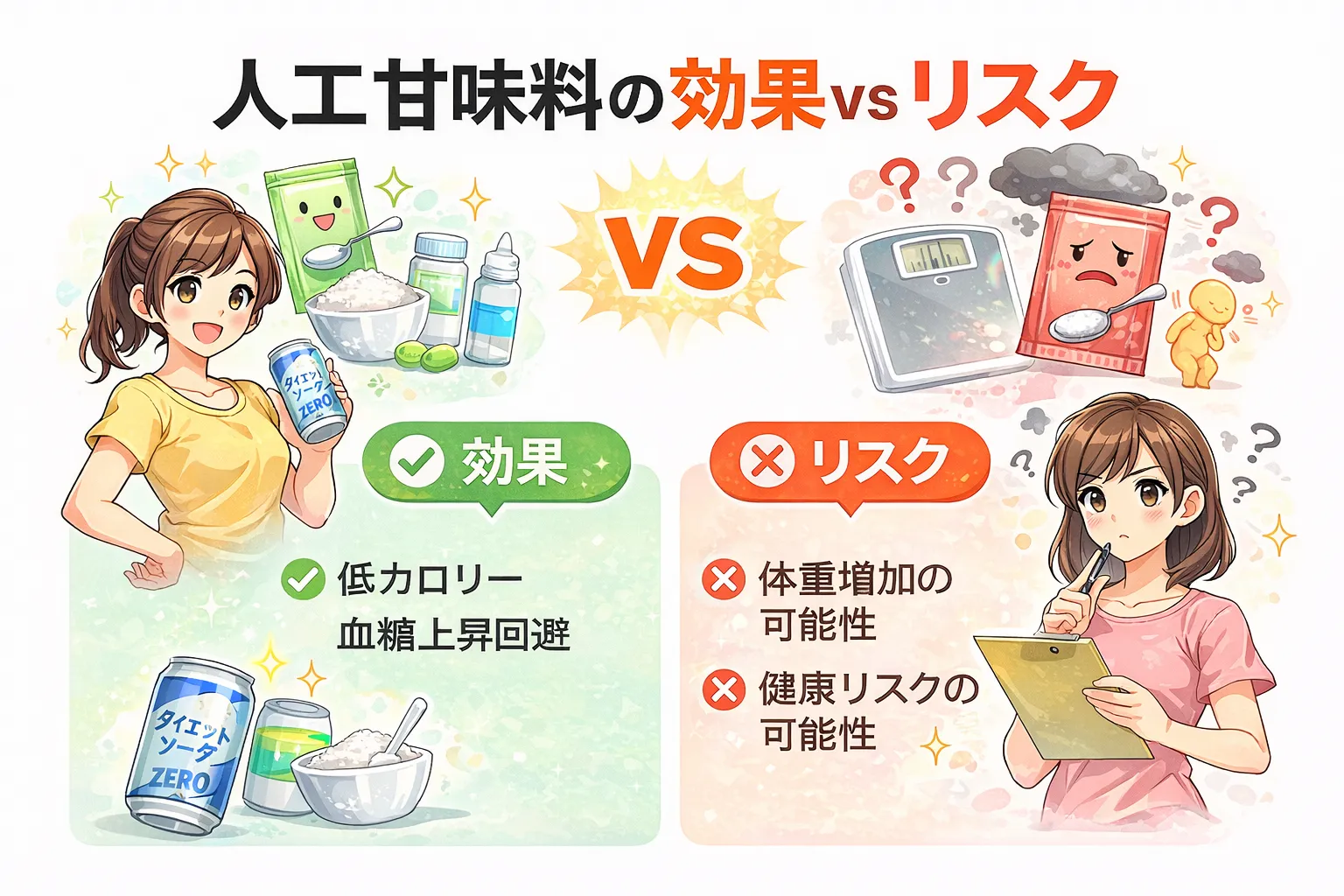 ✔ 人工甘味料はカロリーゼロで血糖を上げにくいが、“痩せる魔法”ではない。