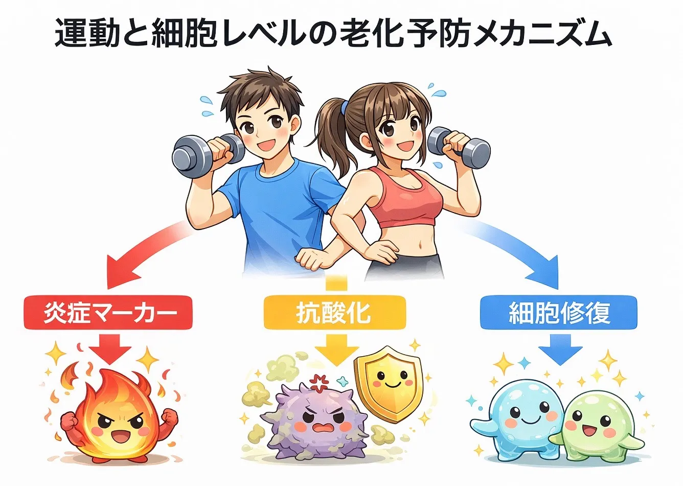 研究では、筋トレ・運動が慢性炎症を低減し、細胞レベルの老化マーカーを改善する可能性が示唆されています。