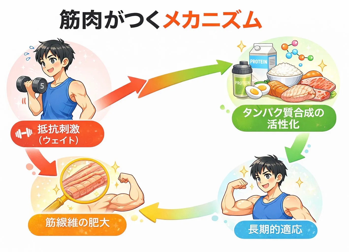 「簡単にすぐ筋肉が付く」という考え方は誤解であり、継続的に適切な負荷を与え続けることこそが確実な成果につながります。