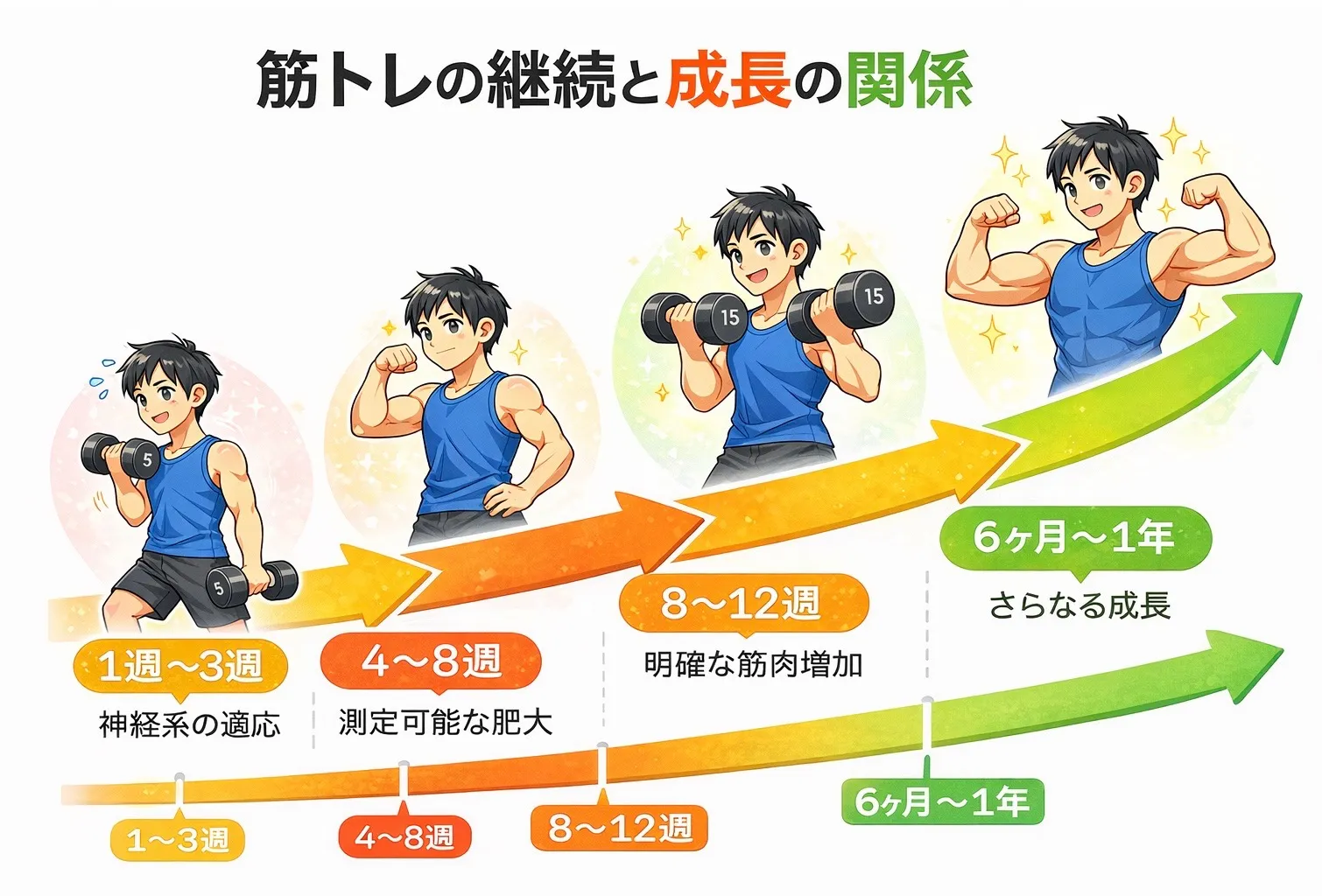 特に初心者の場合は、4〜6週から“測定可能な変化”が出始め、8〜12週を越える頃に明確な筋肥大が観察されるという報告が多く存在しています。