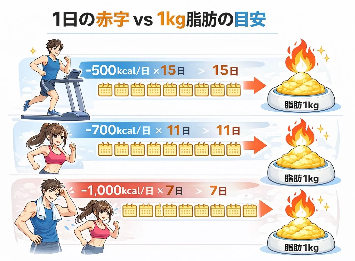 ✔ 1日500kcalの赤字 → 約15日で1kgの体脂肪