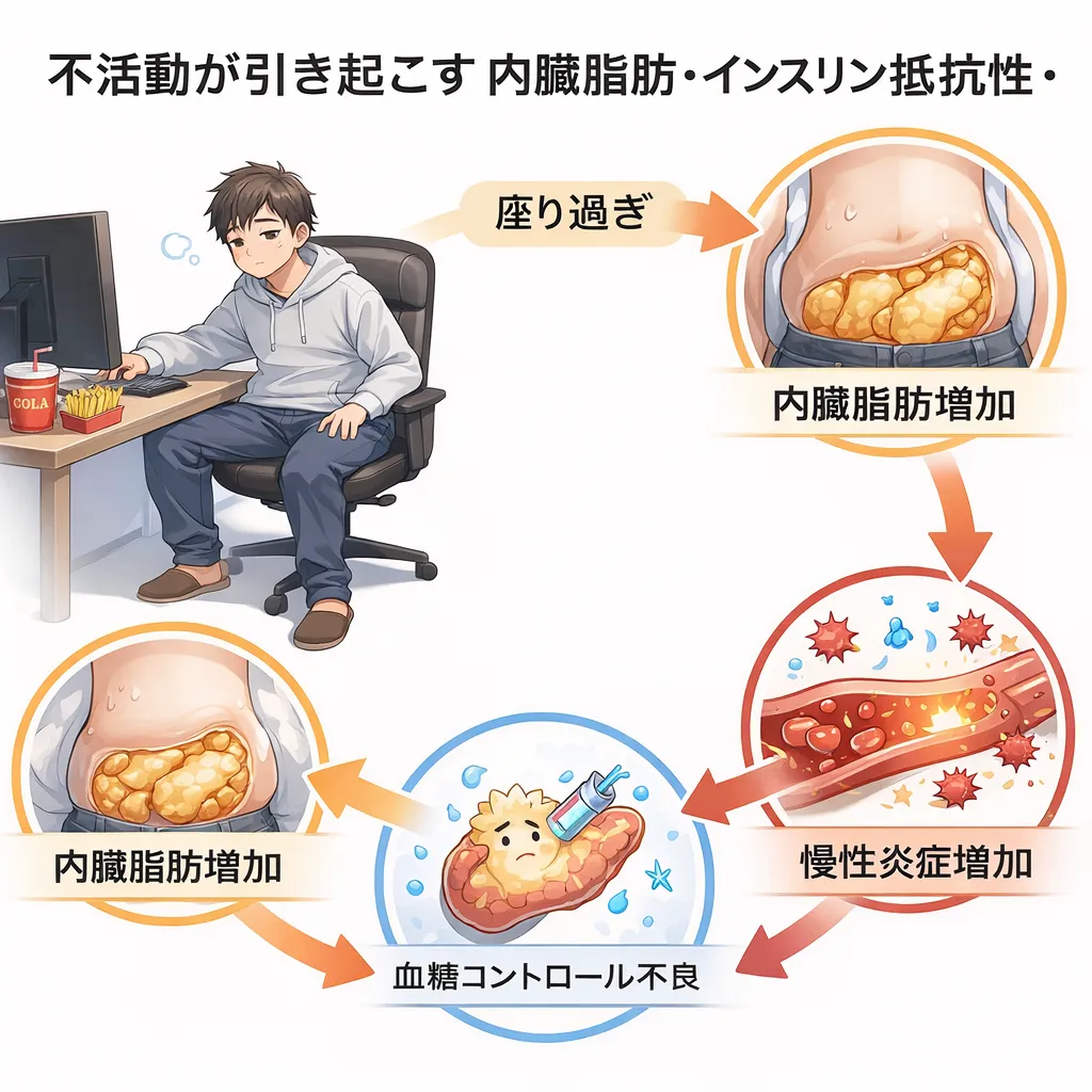 筋肉は動かすことで代謝も循環もホルモンも調整されますが、動かない時間”が長い=不活動(sedentary)な生活は、体の内側でさまざまな悪影響を広げてしまいます。