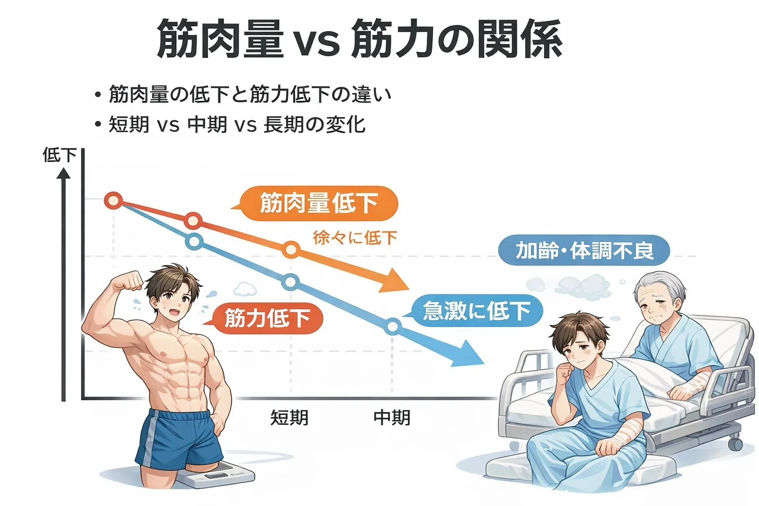これが“筋萎縮”という現象で、筋肉のサイズだけでなく「質」や「力の出し方」まで変わってしまうのです。