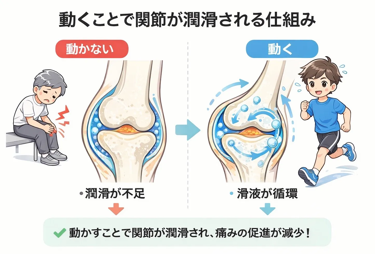 痛みがつらい時は「動かしたくない…」という気持ちになりますが、適切な“動き”はあなたの関節痛を和らげる力になります。