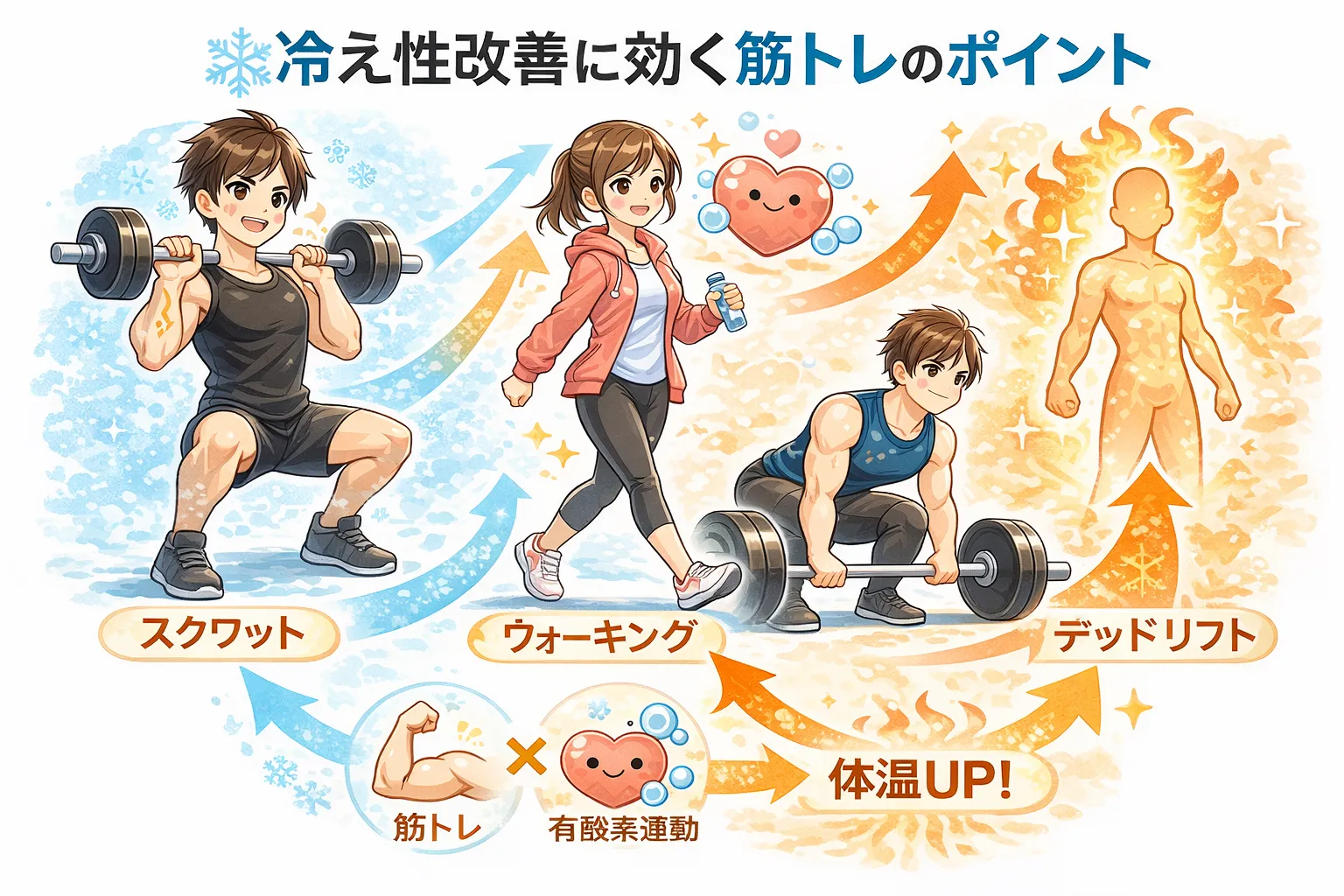 ✔ 筋トレで基礎代謝が上がり、体が内側から温かくなりやすい。