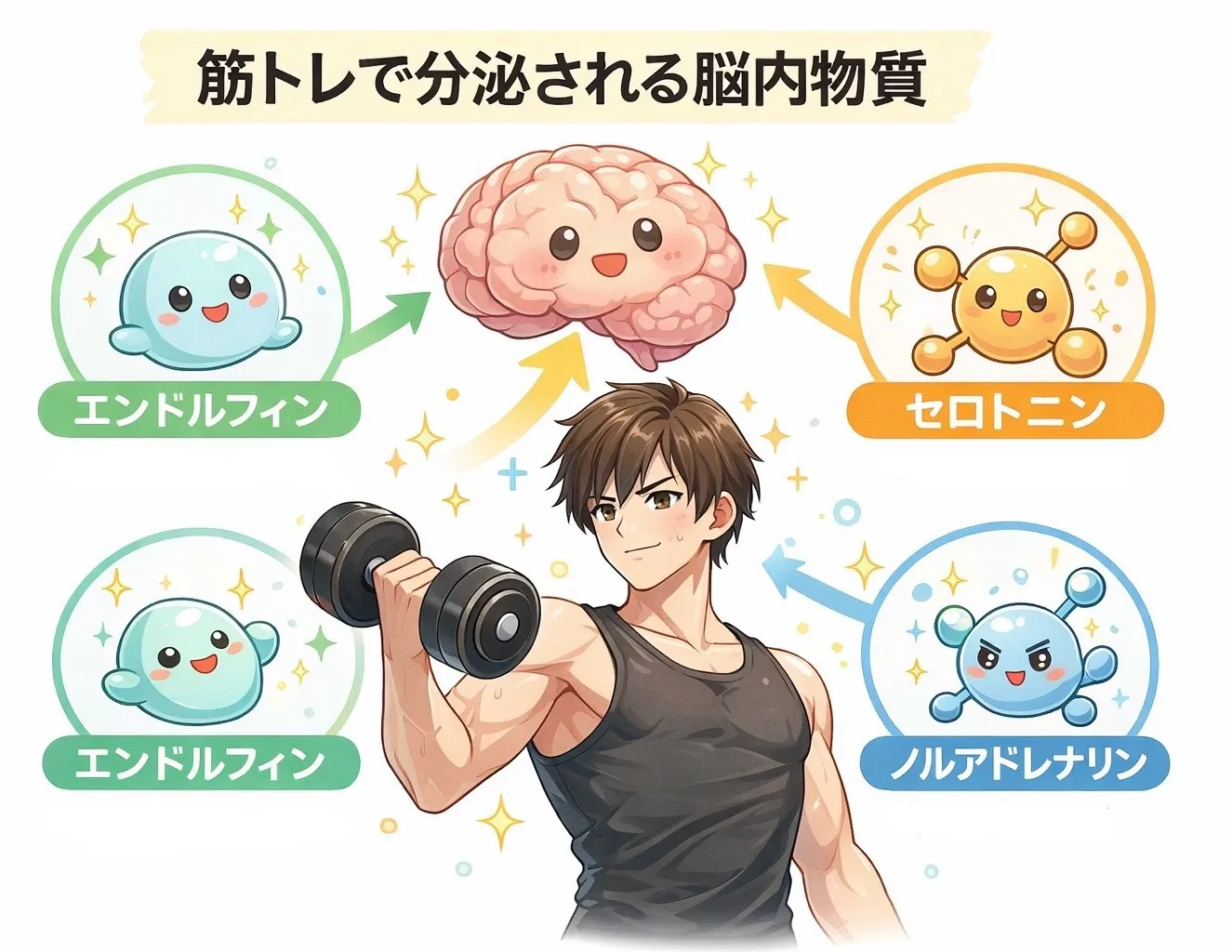 ✔ 筋トレは脳内ホルモンを変化させ、ストレス症状を軽減する。
