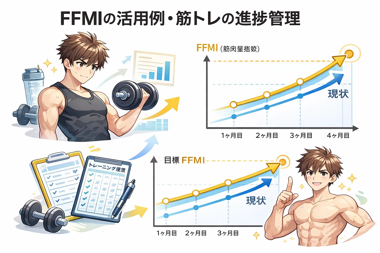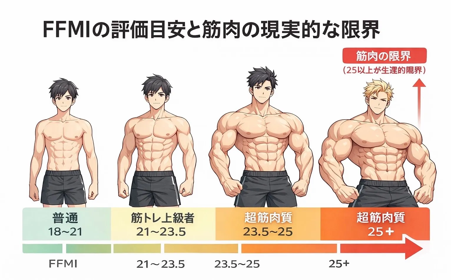 FFMIを見ることで、今の筋肉量がどのレベルか、目標が現実的かどうか、無理な増量・減量をしていないかを客観的に判断できます。