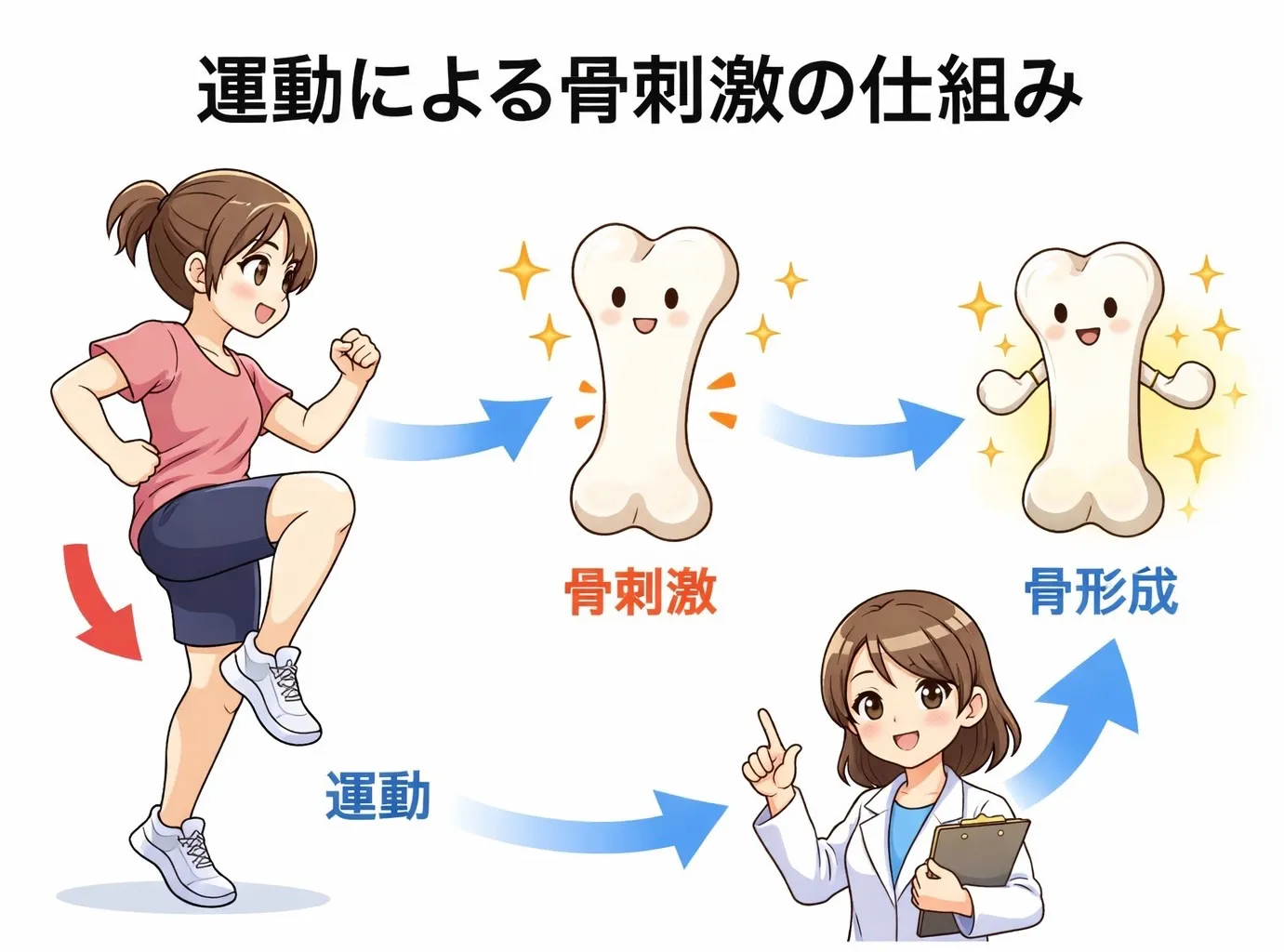 筋肉を使って大きな力を発揮すると、筋肉が収縮する力が骨に伝わり、骨への機械的な刺激が増えることで骨芽細胞(骨を作る細胞)が活性化するのです。