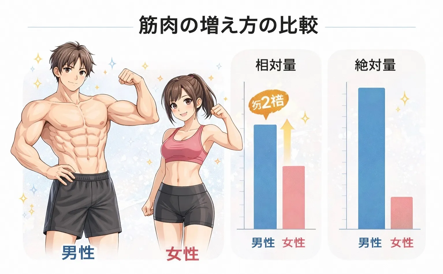 そのため男性は、同じトレーニングを行った場合でも筋肉量の増加量(絶対量)が大きくなる傾向があります。