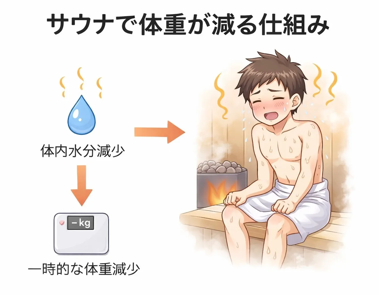 ・サウナで体重が減るのは主に水分の減少によるものです。