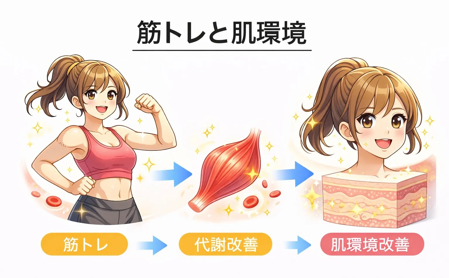 つまり筋トレは、身体の内側の環境を整えることで、間接的に肌にも影響を与える可能性があるのです。