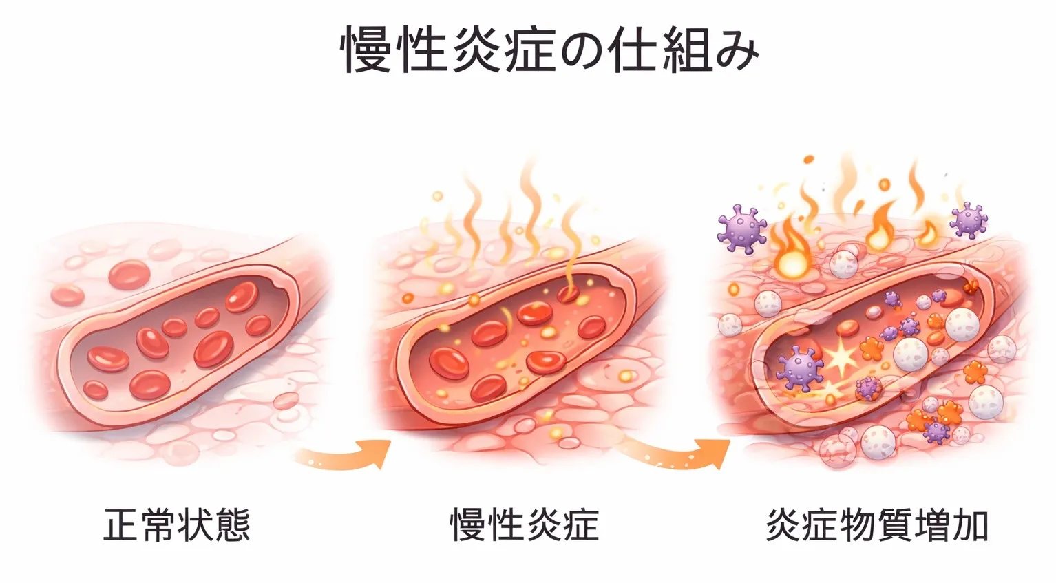 慢性炎症は自覚症状がほとんどないまま体の中で長く続く炎症状態です。