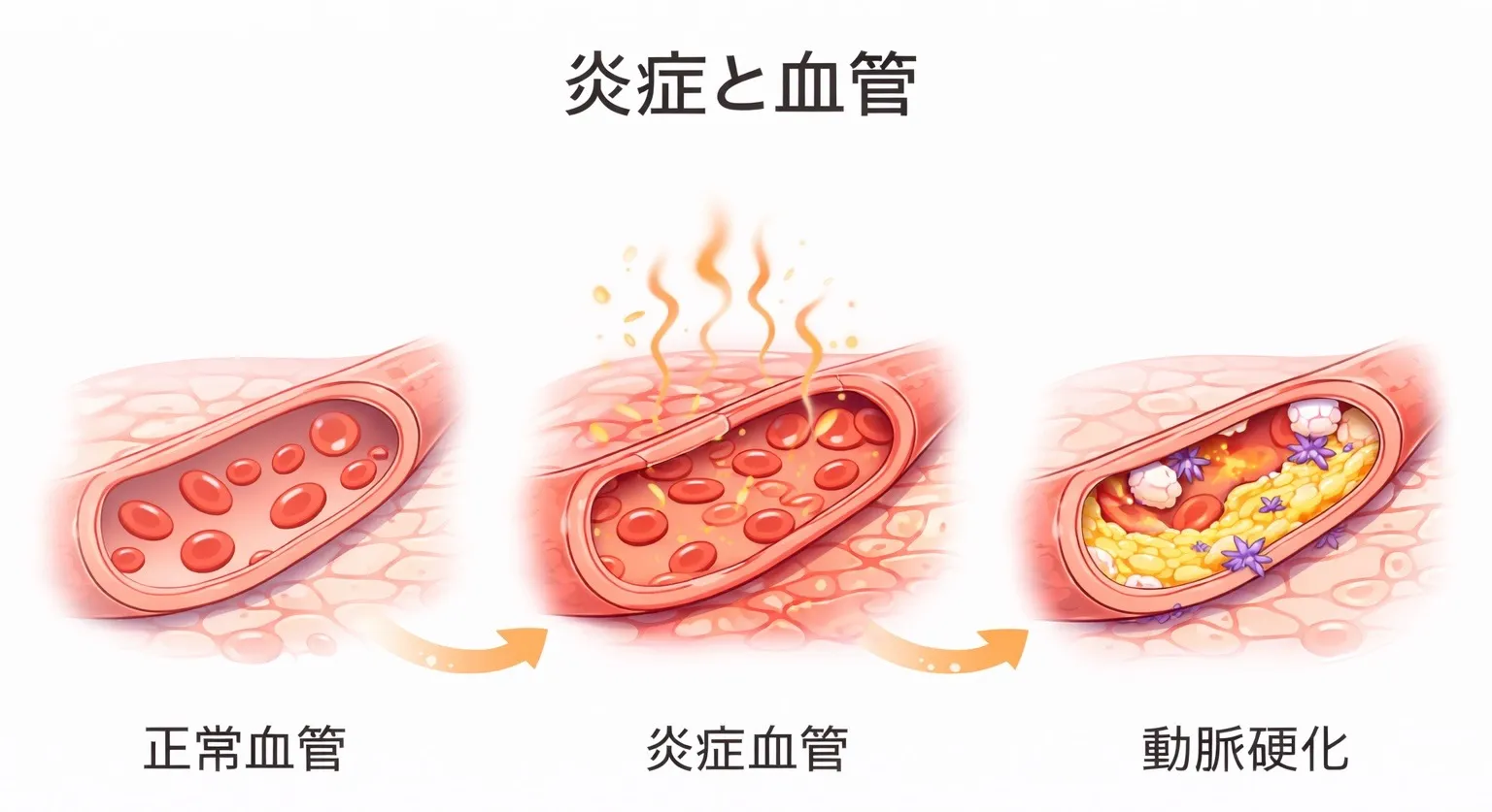 この内皮細胞は血流を調整し、血管の健康を保っていますが、炎症が続くと、この内皮細胞がダメージを受けます。