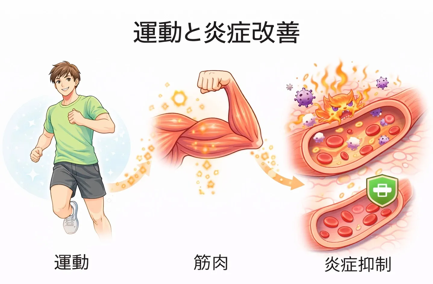 運動すると筋肉からマイオカインが分泌され、炎症性サイトカインを抑える働きがあります。