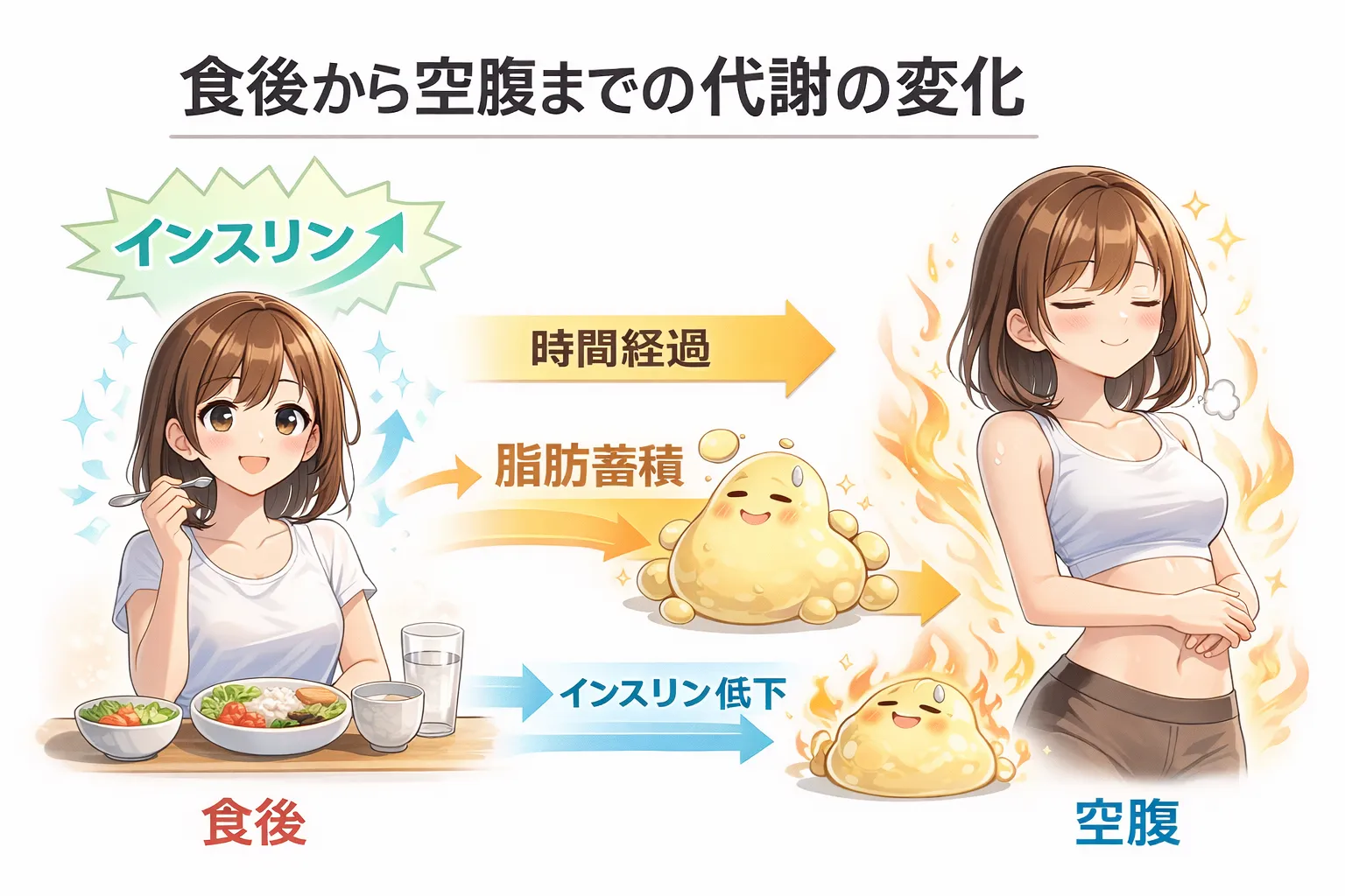 空腹を避け続ける生活では、常にインスリンが分泌され、脂肪が燃えにくい状態が続きます。