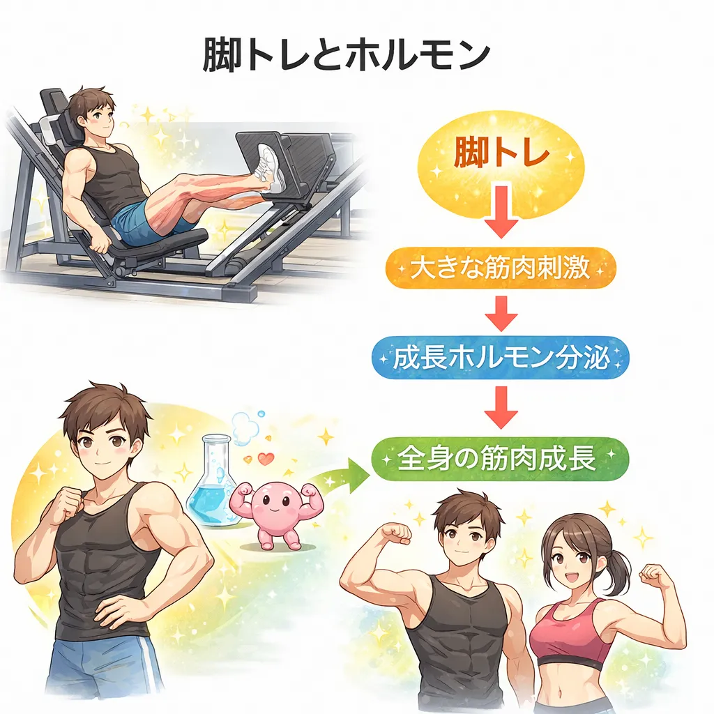 つまり脚トレを行うことで、効率よく全身の筋肉量を増やすことができます。