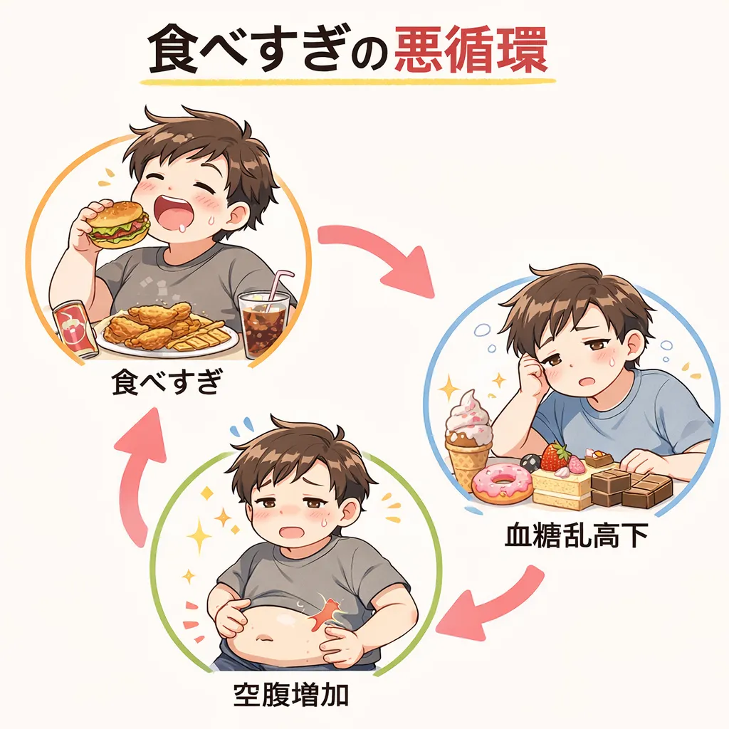 つまり食べすぎは血糖の乱れや食欲の乱れを更に引き起こし、悪循環に入りやすくなります。