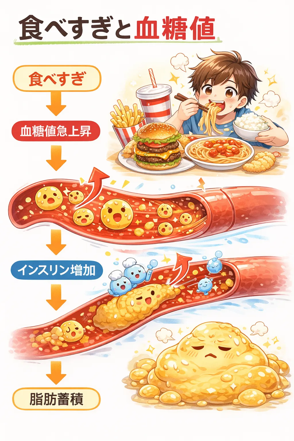 つまり食べすぎは、最初に血糖コントロールの乱れとして現れるのです。