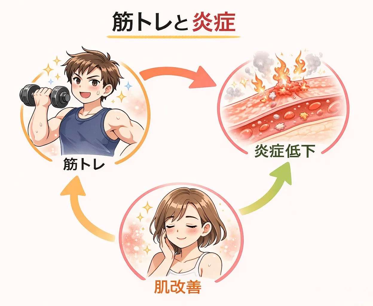 つまり筋トレは、体の内側の炎症を抑えることで、肌トラブルの改善にもつながるのです。