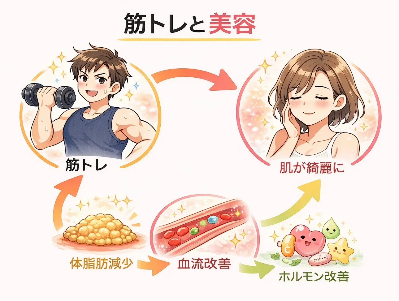 つまり筋トレは、ホルモンの観点からも肌に良い影響を与える可能性があるのです。