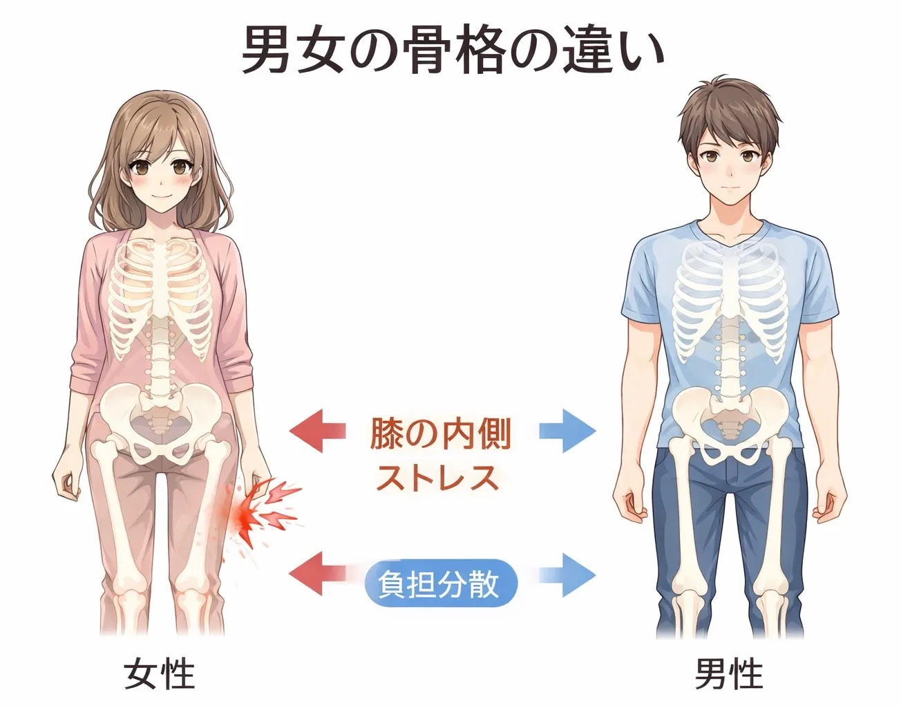 女性は出産のために骨盤が広く、股関節の角度(Q角)が大きい傾向があります。