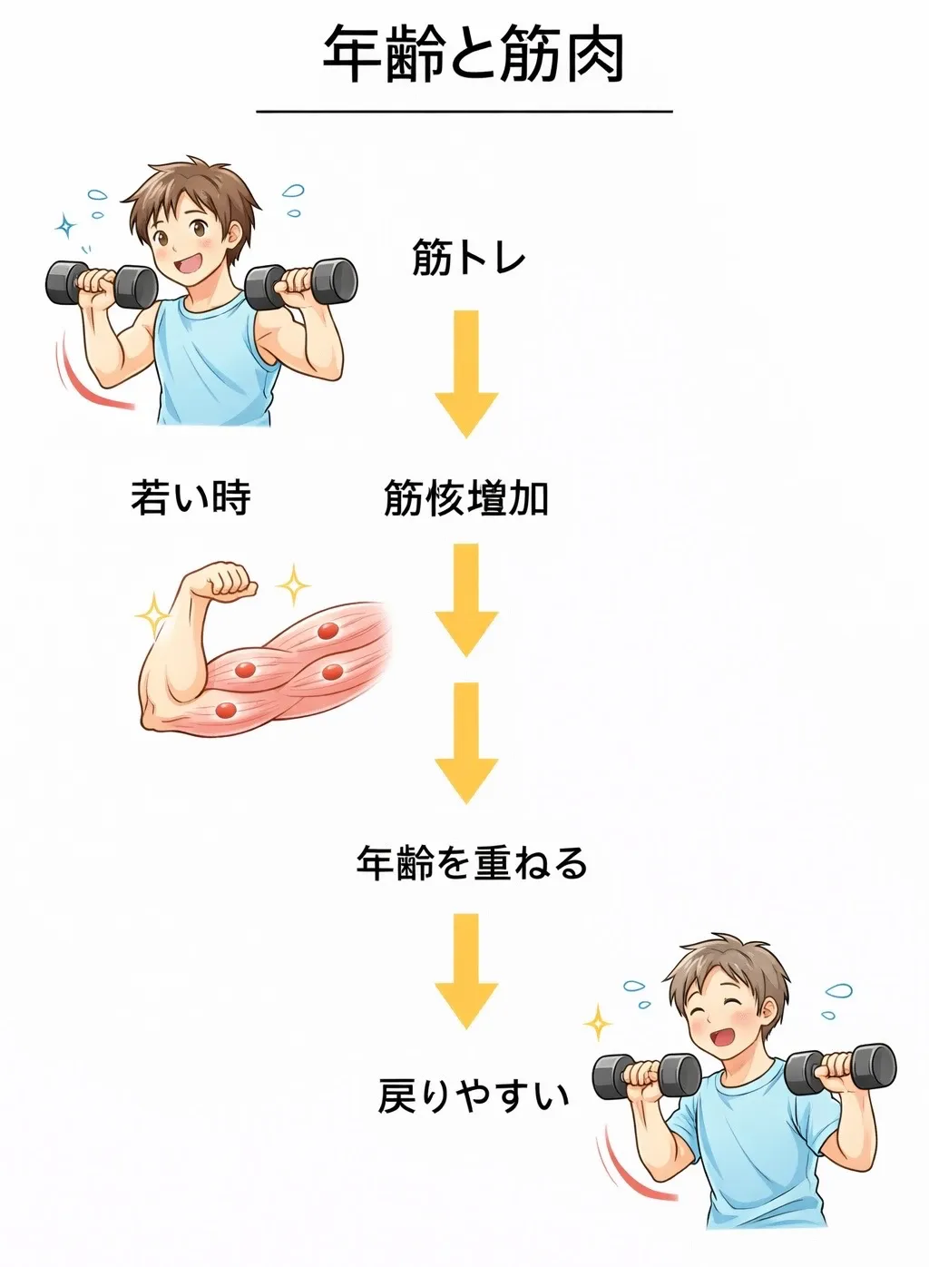 しかし若い頃に筋トレをしていた人は、筋核が残っている可能性があるため、再び筋肉をつけやすいというメリットがあります。