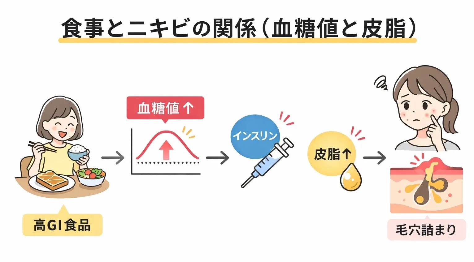 さらに、睡眠不足は食欲を増加させるため、高GI食品の摂取が増えやすくなります。これも間接的にニキビを悪化させる要因です。