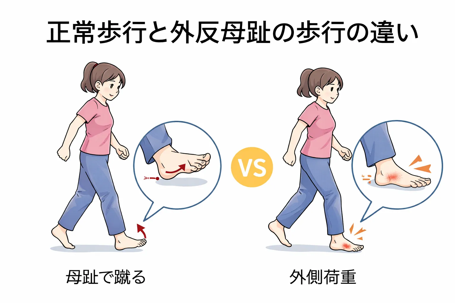 本来、歩行の最後は母趾で地面を押して前に進みます。しかし外反母趾ではこの機能が低下し、代わりに足の外側で逃げるような歩き方になります。