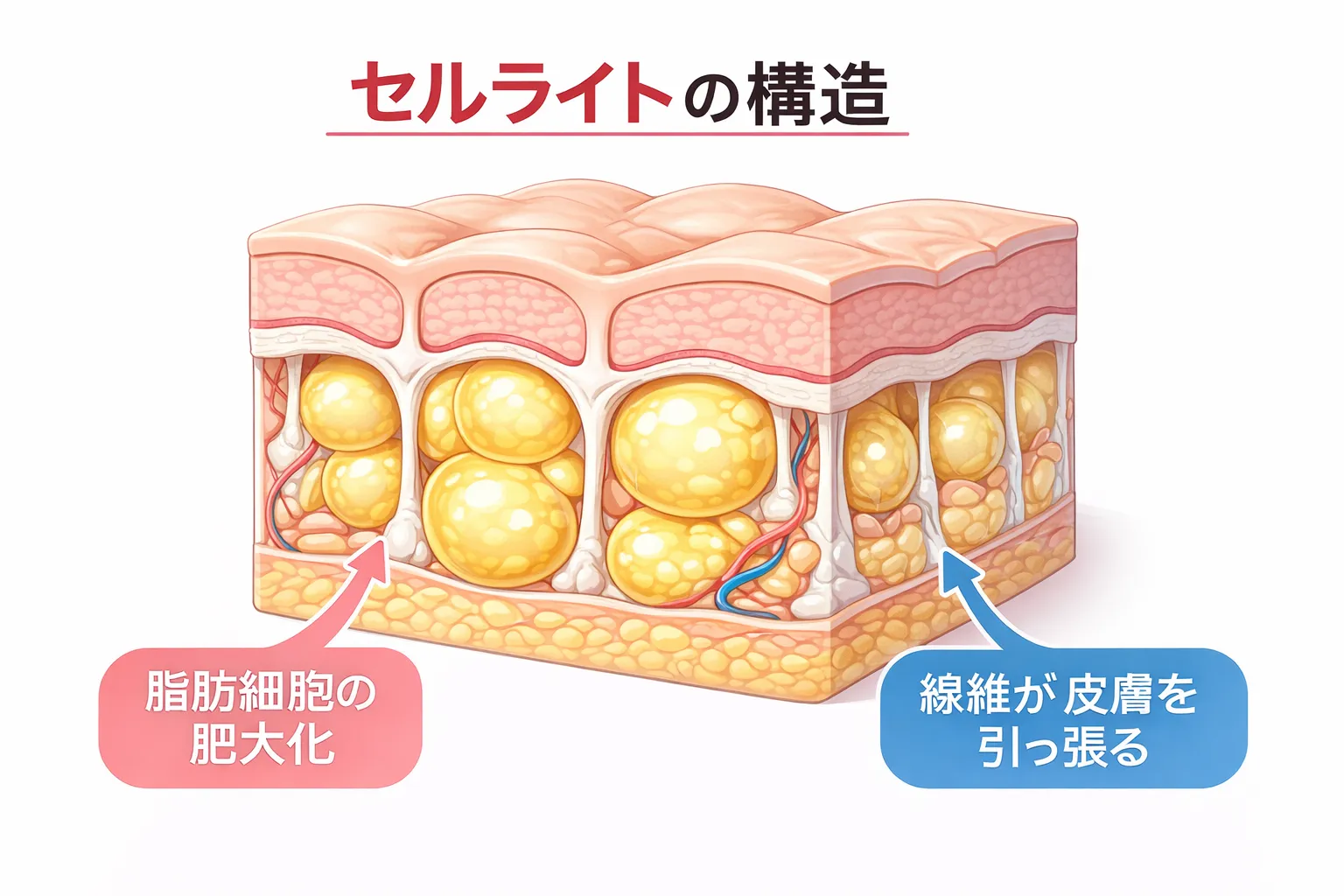 皮下脂肪が増え、それを支える結合組織(線維)が引っ張られることで、皮膚表面がデコボコになる状態です。