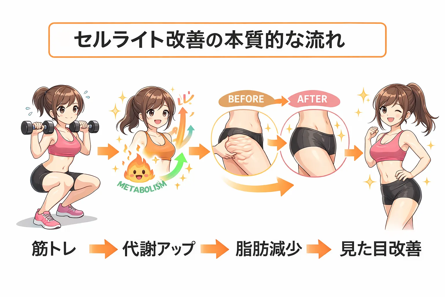 筋トレによって姿勢が改善すると、血流や代謝も改善し、結果としてセルライトの改善につながります。