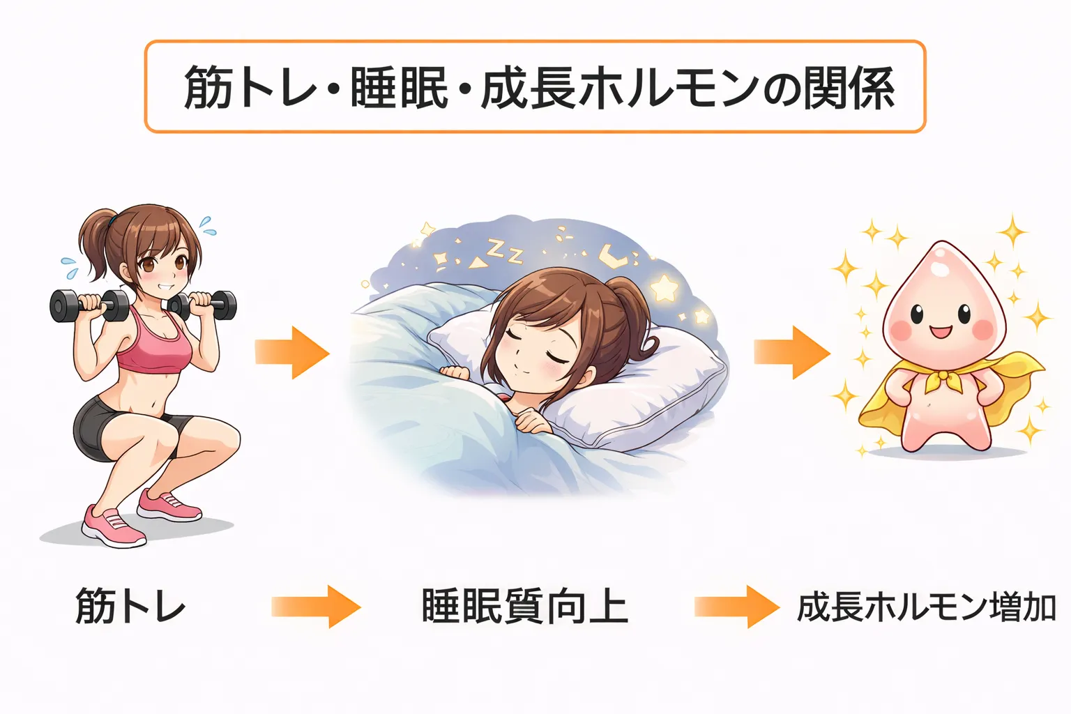 筋トレを行うことで、睡眠の質が向上し、深い睡眠が増加します。その結果として、成長ホルモン分泌も増えます。