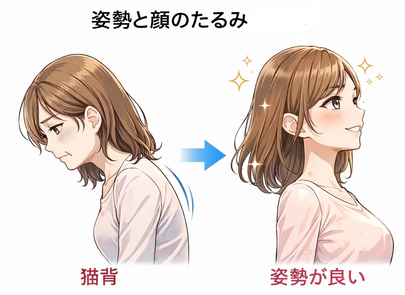 猫背になると首や顎周りの皮膚がたるみやすくなり、結果的にシワが強調されます。