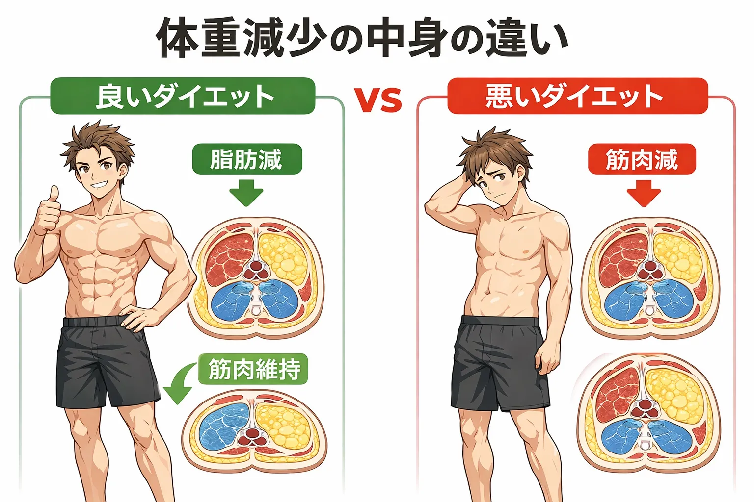 本来目指すべきは、「筋肉を維持または増やしながら、脂肪を減らす」ことです。