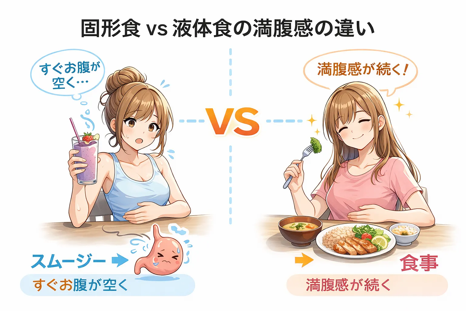 実際、同じカロリーでも固形食より液体の方が満腹感が弱く、過剰摂取につながりやすいという研究もあります。