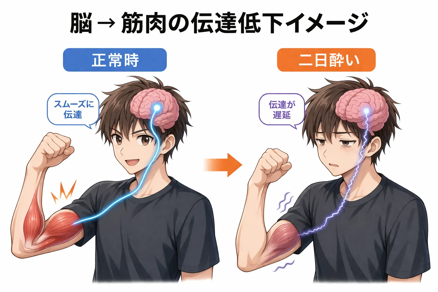 しかしアルコールの影響下では、この神経伝達が遅れたり弱くなったりするため、結果として筋力発揮が低下します。