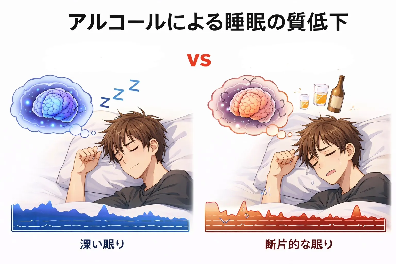 アルコールを飲むと一見眠りやすくなりますが、実際には睡眠の質は低下します。